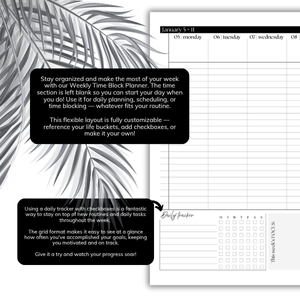 With a clean layout that maximizes your productivity, our Weekly Planner Inserts in the time blocking format are designed to help you take control of your week and achieve your goals efficiently. These inserts feature time slots and dedicated sections for priorities and tasks, perfect for organizing your day with precision.